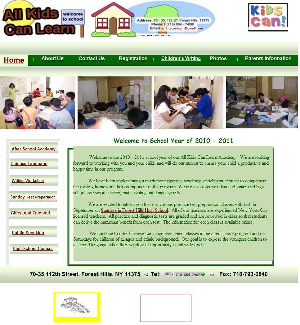 In my first college course in Web Design and Development, our final project in groups of four was to design a website for a client. We redesigned the website for a nonprofit after-school organization called All Kids Can Learn. They have not yet updated their website as of 7/8/2012, but you can see their original website at http://www.allkidscanlearn.net. I had the task of completely reorganizing the website in a much more readable way, as well as creating the papers written with each checkpoint submission, the main PHP layout of the website, and the individual pages. I also had the lead role in the creation of the website and made sure the other three members were creating images, user-testing, and communicating with the client on time.