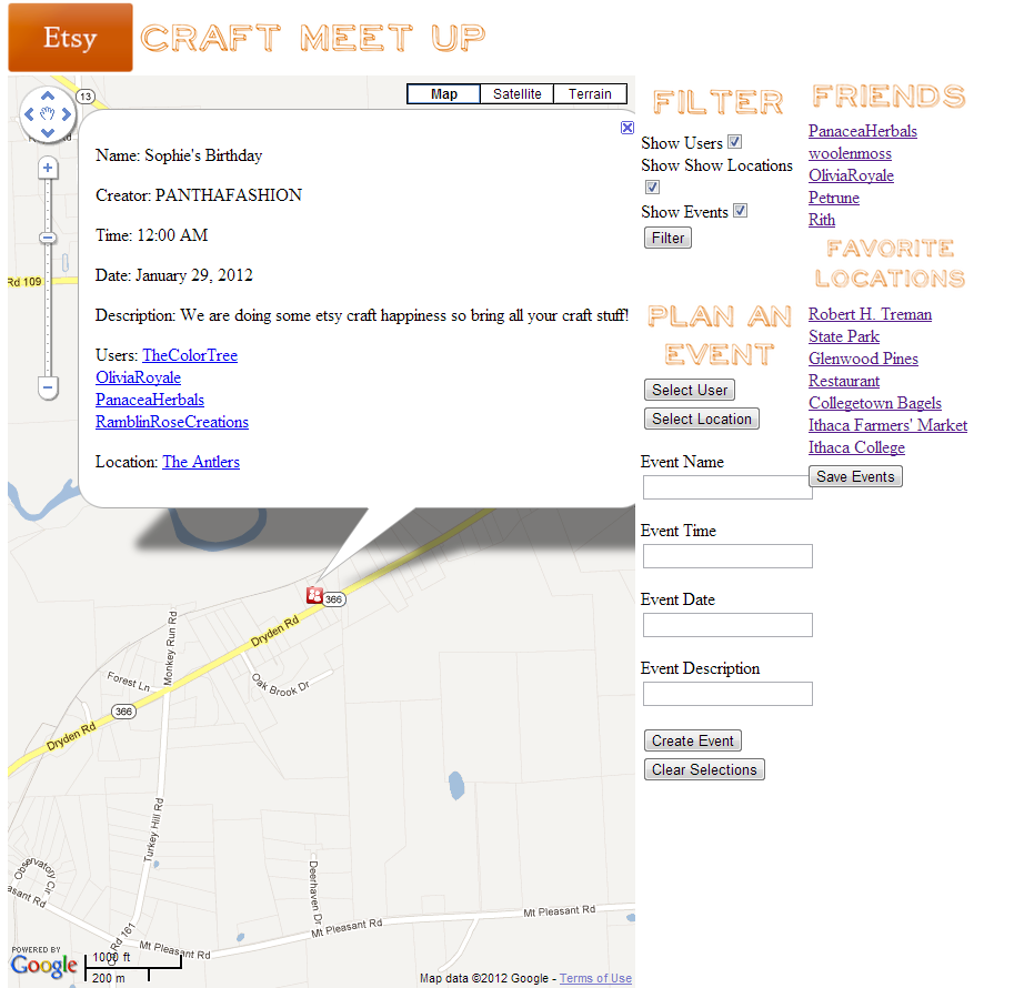 Working in a group of two other people during a college Web Information Systems class at Cornell University, our assignment was to create a web application drawing from several different APIs. We decided to design an application that took the APIs of Google Maps, Etsy, and Yelp to help users decide where they might congregate to craft or sell their Etsy products. Etsy is an online marketplace for handmade goods that individuals around the world create for profit and for fun. Our application takes an Etsy user's location and figures out users nearby and visualizes their location in Google Maps along with ideas for "meeting up" with data from Yelp. Our final application was a use prototype, taking specific users from the Ithaca, NY area as well as nearby Yelp locations. Etsy Users using this app would be able to find, create, and edit events. See a paper description included with the files above. This application is not live.