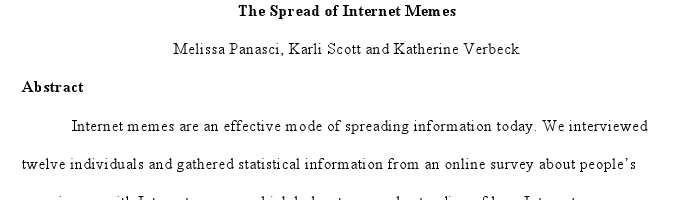 As the final project in a college course on Online Communities, I worked in a group of three with a research topic of our choice to design, create, proceed with, present on and write up. I came up with the basic idea of figuring out which memes spread and why, and with my two other group members, we came up with interview and online questionnaire questions to find out the most popular memes and try and decipher why they were popular. You can see our final paper included in the files above.